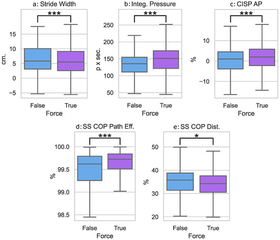 The mean and quartile ranges for the gait parameters that differed based on the application of force: (a) The stride width (cm) between the conditions without force and with 10% body weight (BW) force applied; (b) The integrated pressure (p × s) between the conditions without force and with 10% BW force applied; (c) The AP CISP (%) between the conditions without force and with 10% BW force applied; (d) The single stance COP path efficiency (%) between the conditions without force and with 10% BW force applied; (e) The single stance COP Path Distance (%) between the conditions without force and with 10% BW force applied. The following notation is used for statistical comparisons: *: and ***: .