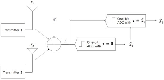 In this study, we propose a successive interference cancellation and detection structure based on a novel interference cancellation scheme designed by adapting the threshold of one-bit ADC. Based on the previous results in [,], and are obtained following binary phase shift keying (BPSK) signaling. At the first stage of the proposed scheme, the receiver detects one transmitter (it can be either or ) signal regarding the other transmitter signal as an interference; the threshold value of the corresponding ADC is zero (Figure 1). At the second stage, the previously detected signal is used as a threshold value for the additional one-bit ADC.