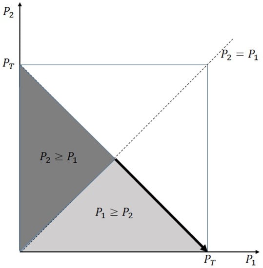 The domain of interest for the maximization is given by the colored region (the union of light and dark gray regions) in Figure 2, whose boundary is described by , , and . In the previous subsection, we explained that the first detection of the transmit signal with higher transmit power is more advantageous. Hence, we can claim that the optimal transmit powers and will exist in the region (light gray-colored region in Figure 2) with a high probability. If (within the dark gray-colored region), then the sum rate is less than the optimal rate (the rate is saturated to the upper bound of , as discussed in Remark 2). For any given , is an increasing function of . Thus, the optimal value will exist in the rightmost boundary of the light-gray region and the optimization problem can be modified as
