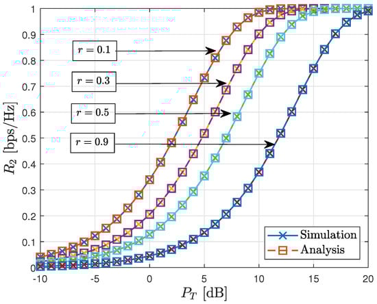 In this subsection, we present simulation results for the AWGN MAC without fading, as described in (1). Figure 3 serves as a verification of Lemma 2, which was discussed in Section 3. The parameter r in the figure represents the transmit power ratio, defined as , where . The dashed lines with square markers (labeled as “Analysis” in the figure) depict the graphs of the analysis results, specifically , as derived in Lemma 2. On the other hand, the solid lines with cross markers (labeled as “Simulation” in the figure) represent the average mutual information between and , which quantifies the achievable rate at the second stage. The simulation results align with the analysis results as presented in Lemma 2, irrespective of the power ratio between the transmitters.