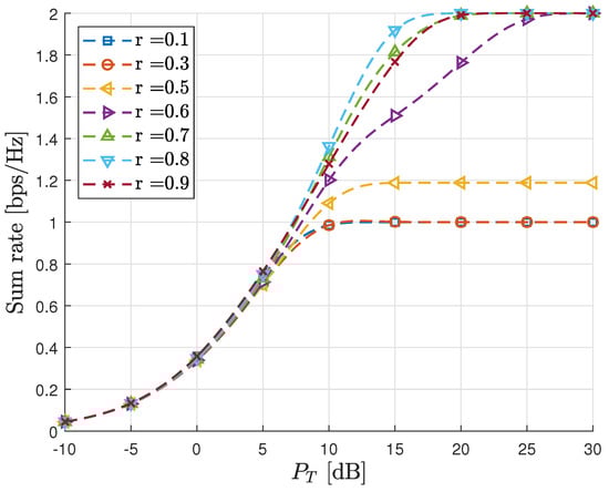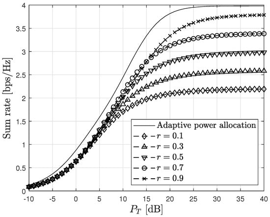 Figure 7 demonstrates the advantage of determining optimal power allocation for each channel realization. This type of adaptive power allocation achieves a considerable gain compared with the cases using fixed power ratios which is independent of channel realizations. In Figure 7, each dashed line represents the sum rates () obtained using a fixed power ratio (r) selected from the set . As observed in the figure, the sum rate increases with r at very high SNR, but this trend diminishes at moderate SNR levels. Thus, it is evident that an appropriate power allocation strategy can further enhance the achievable rate, as previously discussed in Figure 4. The solid line in the figure represents the sum rate achieved using the proposed adaptive power allocation algorithm. By selecting an optimal power distribution based on the given channel realizations, the proposed algorithm globally achieves the maximum sum rate across various SNR levels.