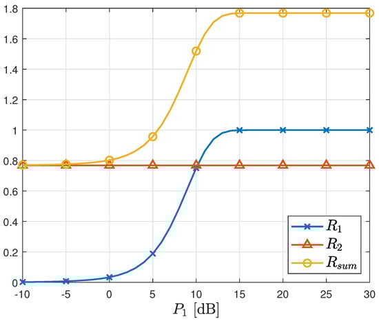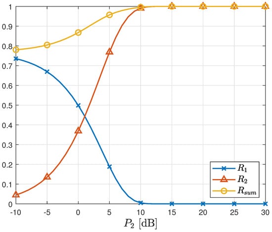 In this subsection, we present simulation results obtained in the AWGN MAC with complex channel fading, as defined in Section 4 of this study. As depicted in Figure 4, the sum rate of the proposed method is found to be sensitive to the power ratio between the received signals, calculated as in the AWGN MAC. Consequently, in the case of the AWGN MAC, an optimal power ratio can be determined through offline simulations conducted over a suitable range of with adequate resolution. However, when considering fading channels, the received signal power ratio, calculated as , is also influenced by the channel gains. Since the range of is the set of positive real numbers, it is practically infeasible to perform offline simulations for all possible combinations of the ratio . Therefore, an optimal power allocation strategy that is applicable in practical scenarios is required to address the challenges associated with fading channels.