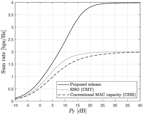 If the receiver uses infinite-resolution ADCs (IR-ADCs), DSP techniques such as successive interference cancellation (SIC) can effectively eliminate non-orthogonal interference. As a result, the channel capacity of a two-transmitter MAC can be twice as high as that of a SISO channel when the transmit power is sufficient []. However, with one-bit ADCs, the capacity has the same upper bound as the SISO capacity [,,], although we have a sufficient transmit power. This is because non-orthogonal inter-signal interference (ISI) between different transmitters cannot be adequately removed using DSP techniques such as SIC due to the nonlinear distortion introduced by one-bit ADCs. Consequently, the performance of DSP-based techniques, such as SIC, is compromised in the presence of one-bit ADCs.