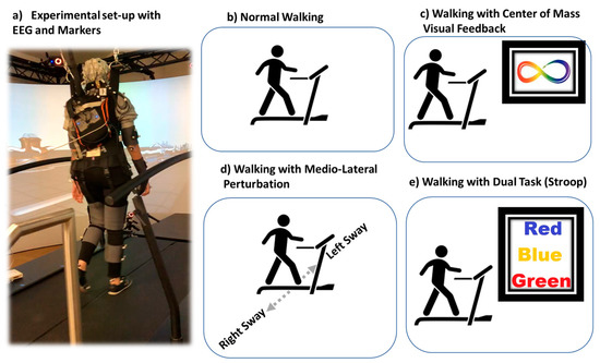 The representative picture of experimental set-up with participant walking on GRAIL treadmill in virtual reality environment is shown in (a) and various conditions of walking performed (b) normal walking, (c) walking with center of mass visual feedback, (d) walking with medio-lateral perturbation, and (e) walking with dual-tasking (Stroop).