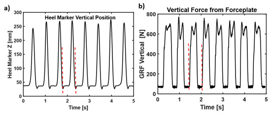 (a) A representative sample of heel vertical positions during walking. The heel strikes are the lowest position of heel marker during walking. (b) Forceplate vertical ground reaction forces. The sudden increase in vertical force is during heel strike. The red dashed lines represent a gait cycle.