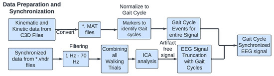 Schematic steps followed for EEG data preparation and synchronization with gait cycle events. Where ‘*’ refers to any file name for MAT files.