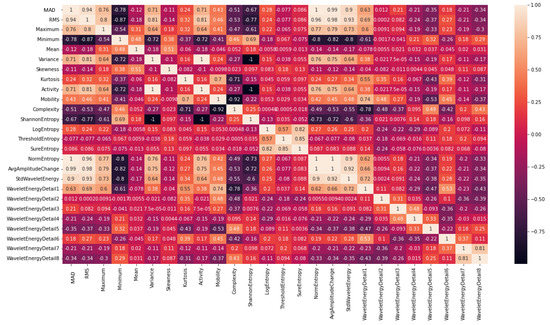 Correlation matrix of features (MAD, RMS, maximum, minimum, mean, variance, skewness, kurtosis, Activity, Mobility, Complexity, Shannon Entropy, Log Entropy, Threshold Entropy, Sure Entropy, Norm Entropy, Average amplitude change, standard deviation of wavelet energy, wavelet energy for detail 1–8) used as input for ML algorithms.