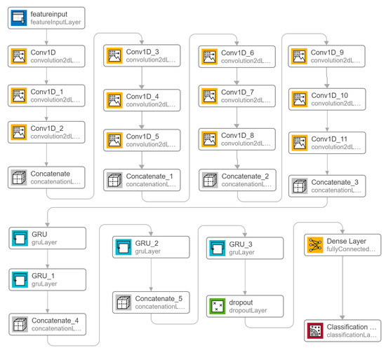 ChronoNet (Figure 8): A deep recurrent neural network (RNN) called ChronoNet, can be designed to identify abnormal patterns in electroencephalogram (EEG) signals [23]. The ChronoNet model processes raw EEG data in a time series format, allowing it to capture the temporal dynamics and patterns of EEG signals over time. The architecture of ChronoNet involves the arrangement of several 1D convolution layers and deep gated recurrent unit (GRU) layers. Each 1D convolution layer utilizes numerous filters with lengths that increase exponentially. The stacked GRU layers are densely connected in a feed-forward manner.