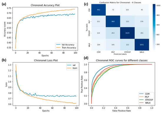 (a) Training accuracy of ChronoNet for four classes (normal walking, Stroop, COM and MLP), (b) training losses for the four classes, (c) confusion matrix, and (d) ROC curves for all four classes.