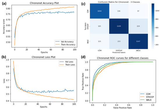 (a) Training accuracy of ChronoNet for three classes (normal walking, Stroop, and COM), (b) training losses for the three classes, (c) confusion matrix, and (d) ROC curves for all three classes.