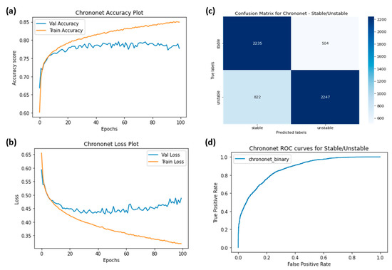 (a) Training accuracy of ChronoNet for two classes (stable and unstable), (b) training losses for the two classes, (c) confusion matrix, and (d) ROC curves for the two classes.