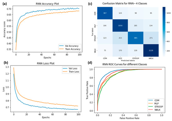 (a) Training accuracy of RNN for four classes (normal walking, Stroop, COM and MLP), (b) training losses for the four classes, (c) confusion matrix, and (d) ROC curves for all four classes.