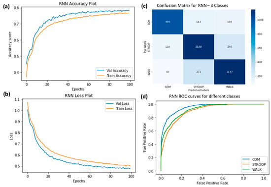 (a) Training accuracy of RNN for three classes (normal walking, Stroop, and COM), (b) training losses for the three classes, (c) confusion matrix, and (d) ROC curves for all three classes.