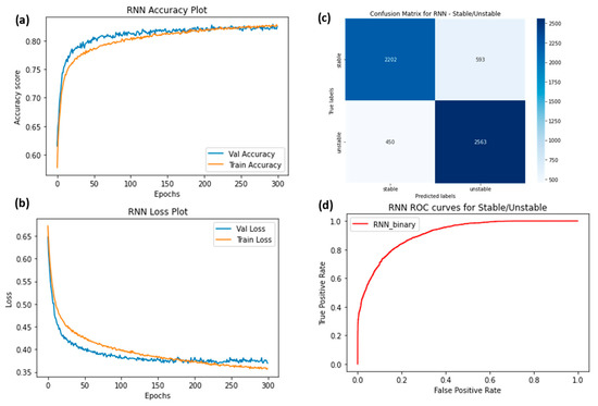 (a) Training accuracy of RNN for two classes (stable and unstable), (b) training losses for the two classes, (c) confusion matrix, and (d) ROC curves for the two classes.