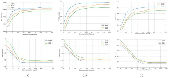Specifically, our approach outperformed method MCB by 8%, 7.3%, and 6% in the three distinct settings, and it showed 3.9%, 3.2%, and 2.7% higher accuracy than method PINS. The superiority of our proposed method becomes more pronounced as the experimental data volume increases. The decreasing trend in loss values across different settings indicates that our AMBR method demonstrates faster convergence compared with other methods. The decreasing trend in loss values across different settings confirmed that our proposed method exhibits faster convergence compared with the other methods. In FL applications, this accelerated convergence speed can significantly reduce the communication bandwidth pressure. Consequently, our method achieves efficient utilization of communication bandwidth while ensuring optimal model performance.