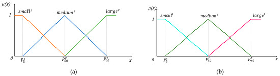 In traditional classification problems, a sample can only belong to one class, while using the fuzzy set method allows a sample to belong to multiple classes to varying degrees, therefore, for the output of the z-th source domain, the 5th, 50th, and 95th percentile values are found and denoted as . Three fuzzy sets denoted as are defined based on these percentiles, as shown in Figure 1.