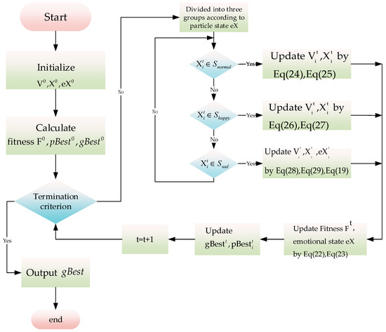 where represents global perception, represents historical perception, k is a constant factor, S(·) is the stimulus function, is the stimulus threshold, gBest is the historical best position of the particle swarm, and is the historical position of the i-th particle. According to the paper [35], the velocity and position update formulas for a particle in a normal emotional state are: