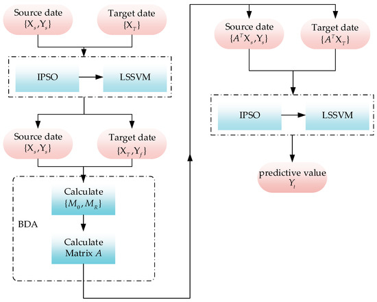 - Obtain soft label for target domain data by iteratively inputting unlabeled data into the IPSO-LSSVM model: Since the target domain data are unlabeled, the unlabeled target domain data are input into the IPSO-LSSVM model obtained in step 3 to generate predicted values , which are then used as soft labels. The soft labels are then combined with the target domain data .
