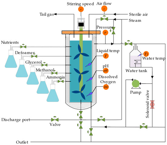 - The fermentation system was sterilized and the bacterial strain was cultured according to the requirements of the Pichia pastoris fermentation process. The medium was sterilized at 130 °C for 30 min, and the bacterial strain was inoculated by flame when the temperature dropped to 30 °C. The initial fermentation conditions were set: initial tank pressure control at 0.02~0.05 MPa; pH control at 5.0; temperature control at 28 °C; speed set at 300~400 rpm; and airflow velocity control at 150~300 L/M.