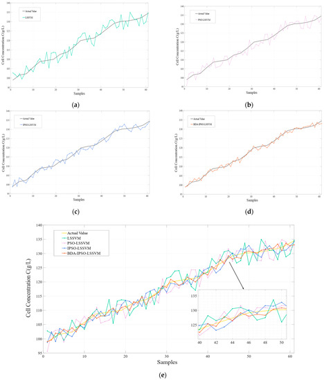 Prediction results of different models for cell concentration: (a) LSSVM; (b) PSO-LSSVM; (c) IPSO-LSSVM; (d) BDA-IPSO-LSSVM; (e) Combination of the four models.