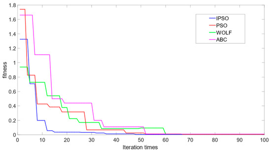 The fitness curve of the IPSO, PSO, WOLF and ABC optimization algorithms.