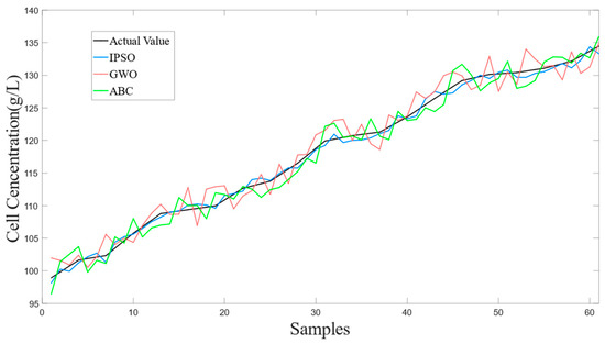 To better demonstrate the effectiveness of the proposed method in this article, simulations were conducted for the LSSVM soft sensor model, the PSO-LSSVM soft sensor model, the IPSO-LSSVM soft sensor model, and the BDA-IPSO-LSSVM soft sensor model, respectively, to achieve real-time prediction of cell concentration C and product concentration P of Pichia pastoris. The simulation results for cell concentration C are shown in Figure 6, where Figure 6a represents the simulation result for LSSVM, using the RBF function as the kernel function, the regularization parameter set to 125, and the RBF kernel width set to 10. PSO and IPSO were introduced to optimize the LSSVM model, with the regularization parameter lower bound set to zero, the upper bound set to 300, the initialization set to 100, the kernel width lower bound set to zero, the upper bound set to 50, the particle swarm size set to 100, and set to 0.35, when the number of iterations reaches 200 or the global optimal position is less than 110, it is used as the termination condition of the IPSO algorithm. Finally, the IPSO algorithm was used to obtain the optimized LSSVM regularization parameter of 132.4 and kernel width of 16.4, resulting in the simulation results shown in Figure 6b,c, respectively. The “actual value” in the figures represents the real value measured during the fermentation experiment of Pichia pastoris. In order to further illustrate the effectiveness of the proposed IPSO algorithm, Figure 7 shows the fitness curves of the PSO algorithm and the IPSO algorithm. It can be seen that the fitness of the IPSO algorithm is significantly better than that of the PSO algorithm. To further demonstrate the favorable convergence performance and optimization capability of the IPSO algorithm, a comparative analysis was conducted by the IPSO with two classical optimization algorithms, namely Grey Wolf Optimization [39] (GWO) and Artificial Bee Colony [40] (ABC), under identical input conditions. Figure 7 presents the fitness curves of the IPSO, PSO, GWO, and ABC optimization algorithms. It is evident that the IPSO algorithm exhibits a significantly accelerated optimization speed in comparison to the other algorithms. Concerning the prediction results for the cell concentration of Pichia pastoris, Figure 8 shows the prediction result of the IPSO-LSSVM, WOLF-LSSVM and ABC-LSSVM. The figure distinctly illustrates that IPSO-LSSVM produces markedly smaller prediction errors compared to the other two algorithms. The results provide substantial evidence that the IPSO algorithm demonstrates pronounced superiority in terms of parameter optimization effectiveness, surpassing both GWO and ABC algorithms.
