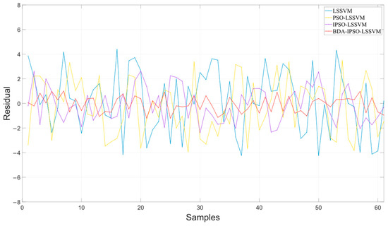 Figure 9 shows the residuals of the different soft sensor models in predicting the cell concentration of Pichia pastoris. The prediction performance of the soft sensor models is shown in Table 1. It can be intuitively seen in Figure 8 and Table 1 that the BDA-IPSO-LSSVM residual is relatively small compared to other models, and it performs well in the RMSE, R2, and MAE performance metrics. GFLOPs reflects the complexity of the model. From the value of GFLOPs of each model in Table 1, it can be seen that the proposed hybrid model does not increase the complexity of the model.