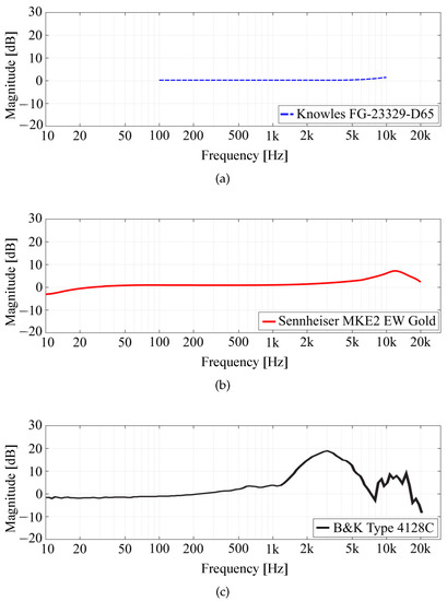 Frequency responses of (a) Knowles FG-23329-D65 [65], (b) Sennheiser MKE2 EW Gold [66], and (c) Brüel & Kjær head and torso simulator (HATS) Type 4128C [67], provided by the manufacturers.