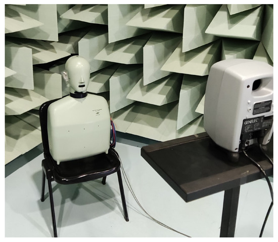 The HRTFs measured with the two microphones are compared with the ones measured with the Brüel & Kjær head and torso simulator (HATS) Type 4128C, i.e., a binaural mannequin used as a reference and shown in Figure 1c. The frequency response of the mannequin is reported in Figure 2c. In this case, the magnitude response is not flat due to the effect of the ear of the dummy head. For the measurements with the B&K simulator, the mannequin is connected to its power supply B&K PS 2829. Moreover, the microphones and a Genelec 8020 A are connected to the Scarlett Focusrite 2i2 soundcard, managed by a computer that uses the NU-Tech software (version 2.0) [68] for the acquisitions. The frequency response of the Genelec loudspeaker is declared flat ( dB) in the frequency range of 66 Hz–20 kHz by the manufacturer. The measurements have been carried out inside a semi-anechoic chamber and taking into account only the left ear. The scheme of the acquisition chain used for HRTF measurements is shown in Figure 3. A photo of the experimental setup is shown in Figure 4.