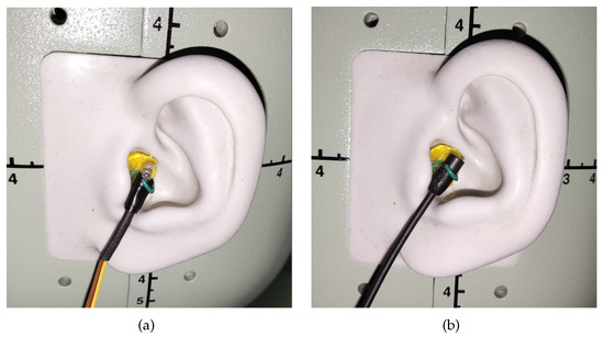 Figure 7. Photos of the (a) Knowles and (b) Sennheiser microphones on the ear of a real subject.