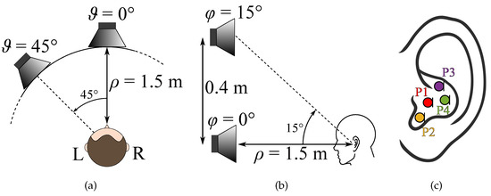 The first experiment aims at analyzing the differences between the HRTFs measured with the mannequin and the HRTFs measured with the in-ear microphones settled on the dummy ear. The in-ear microphones have been placed in the mannequin ear considering four different positions, as shown in Figure 6c. Figure 5 shows the real microphone placement for position P1. Furthermore, four different positions of the sound source have been taken into account varying the azimuth and the elevation , as shown in Figure 6a,b, i.e., , and .