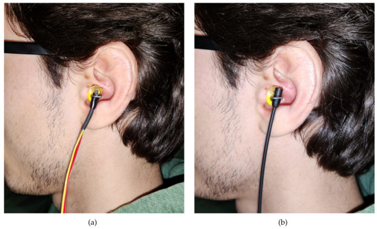 The two microphones have been settled on the left ear of the mannequin and of the subjects by means of a hook fixed on earplugs, as shown in Figure 5 and Figure 7. The measurements carried out with the in-ear microphones have been compared with the ones executed with the mannequin. It must be underlined that the comparison has been performed taking into consideration that the placement of the in-ear microphone occludes the ear canal, which is open when the HATS simulator is used.