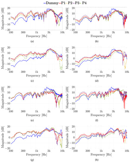 Experiment 1: HRTFs comparison considering the different in-ear microphone positions of Figure 6c for sound source positions (a,b) with and , (c,d) with and , (e,f) with and , and (g,h) with and , using (a,c,e,g) the Knowles microphone, and (b,d,f,h) the Sennheiser microphone.