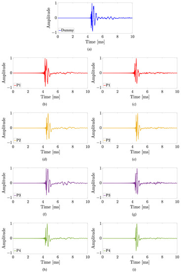 Experiment 1: Impulse responses comparison considering the different in-ear microphone positions of Figure 6c for the sound source position with and , using (a) the HATS, (b,d,f,h) the Knowles microphone, and (c,e,g,i) the Sennheiser microphone.