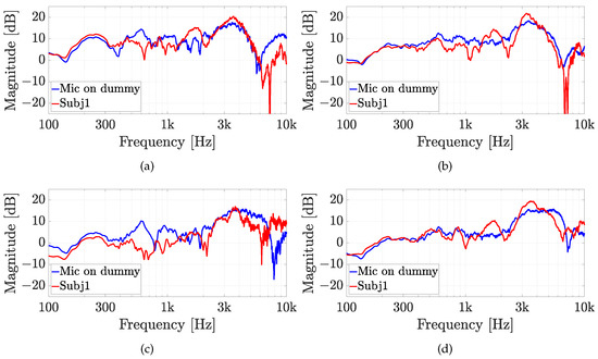 Experiment 2: HRTFs comparison of subject 1 with (a,b) the Knowles microphone and (c,d) the Sennheiser microphone for (a,c) , and (b,d) and a fixed elevation of . The measurements are compared with the same microphone on the dummy ear.