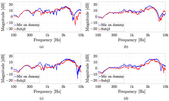 Experiment 2: HRTFs comparison of subject 2 with (a,b) the Knowles microphone and (c,d) the Sennheiser microphone for (a,c) , and (b,d) and a fixed elevation of . The measurements are compared with the same microphone on the dummy ear.