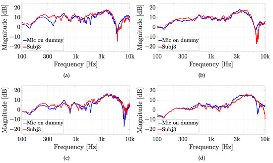 Experiment 2: HRTFs comparison of subject 3 with (a,b) the Knowles microphone and (c,d) the Sennheiser microphone for (a,c) , and (b,d) and a fixed elevation of . The measurements are compared with the same microphone on the dummy ear.