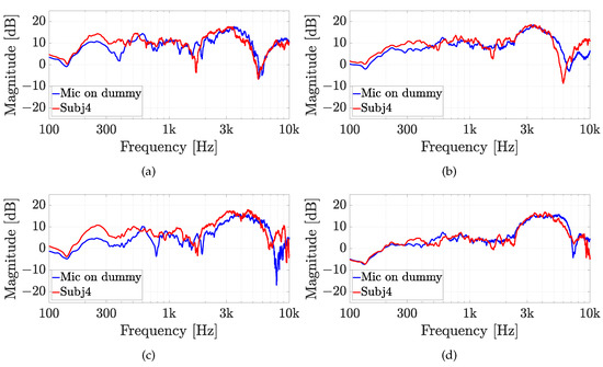 Experiment 2: HRTFs comparison of subject 4 with (a,b) the Knowles microphone and (c,d) the Sennheiser microphone for (a,c) , and (b,d) and a fixed elevation of . The measurements are compared with the same microphone on the dummy ear.