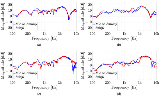 Experiment 2: HRTFs comparison of subject 5 with (a,b) the Knowles microphone and (c,d) the Sennheiser microphone for (a,c) , and (b,d) and a fixed elevation of . The measurements are compared with the same microphone on the dummy ear.