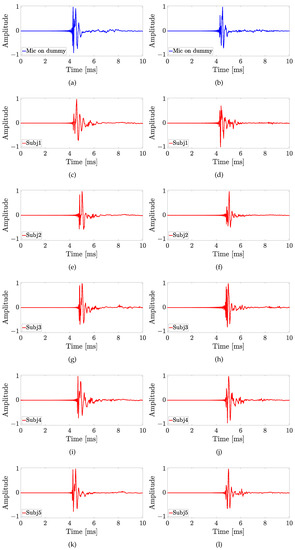 Experiment 2: Impulse responses measured with the Knowles microphone (first column) and the Sennheiser microphone (second column) on (a,b) the dummy head, and (c–l) on five real subjects for the sound source position with and .