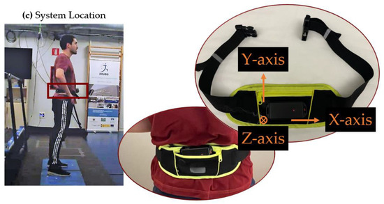The hardware of the developed system comprises an Inertial Measurement Unit, a Bluetooth module, a rechargeable power supply, and an SD card slot (see Figure 1a). The system is securely positioned on the lower back of the subject’s waist using a tight sport belt, as close as possible to the mass center [34,36,37,47,48] (see Figure 1c). The orientation of the IMU is depicted in Figure 1c, where the Y-axis corresponds to the vertical direction. The prototype utilizes the 9DoF Razor IMU MO (SparkFun Electronics, Niwot, CO, USA), which combines a SAMD21 microcontroller (Microchip Technologies Inc. Systems, Chandler, AZ, USA) with an MPU-9250 9DoF (Degree of Freedom) sensor (TDK InvenSense, San Jose, CA, USA), providing nine degrees of inertial measurement. The sensor includes a MEMS triple-axis gyro (ITG-3200) (TDK InvenSense, San Jose, CA, USA), triple-axis accelerometer (ADXL345) (Analog Devices, Wilmington, MA, USA), and triple-axis magnetometer (HMC5883L) (Honeywell, Charlotte, NC, USA). The ADXL345 accelerometer was configured within the range of ±16 g, where g represents the gravity acceleration. The acceleration was digitalized with a 16-bit analog-to-digital converter with a resolution of (1/2048) g, and a tolerance of 3%. The system also incorporates an SD card socket for data storage and a power supply module that monitors the Li-ion battery charge and regulates the power supply voltage. Wireless communication is facilitated by a BM78 Bluetooth module (Microchip Technologies Inc., Chandler, AZ, USA). An LED indicator is included in the device to display the system’s status. Consequently, the LED starts flashing when the power button is turned on, blinks quickly during the Bluetooth paring process, and blinks at a slower rate during measurements. To ensure extended operation during multiple training sessions, the system is equipped with a 450 mAh lithium-polymer battery, which offers sufficient autonomy as the average consumption of the system is approximately 50 mA. In terms of physical characteristics, the system weighs 47 g, and has dimensions of 80 40 15 mm, making it practically unnoticeable to the athlete.