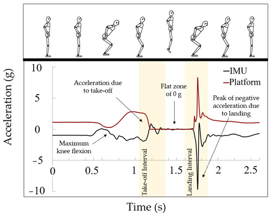 In the case of the platform, it registers a resting acceleration value of 1 g, which corresponds to the subject’s weight. The flat area at 0 g indicates the absence of applied force, which corresponds to the flight phase. The data then show a sharp peak during the subject’s descent upon returning to the ground. In this case, the flight time can be obtained from the data provided by the platform, since the exact take-off and landing points can be accurately identified using proprietary software. Therefore, flight time can be obtained by subtracting both time values. In addition, the software can directly provide the jump height, which will be also compared and analyzed.