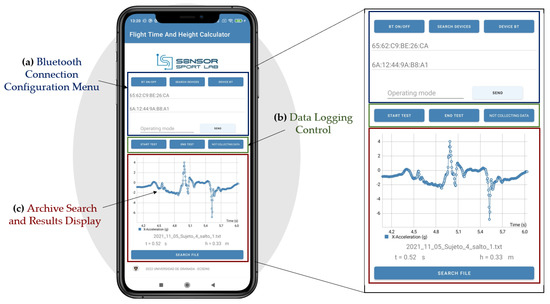 Overview of the custom smartphone application: (a) Bluetooth connection configuration menu; (b) Data logging control, used t initiate and terminate data acquisition and storage; (c) Archive search and results display.