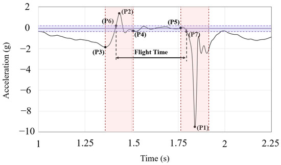 The intervals derived from steps 1 and 2 are used to precisely identify the take-off and landing points. For this purpose, within the take-off interval, the first value exceeding the threshold of the “floating acceleration” value is designated as the exact take-off point (P6), while within the landing interval, the first value that falls below this threshold is identified as the exact landing point (P7).