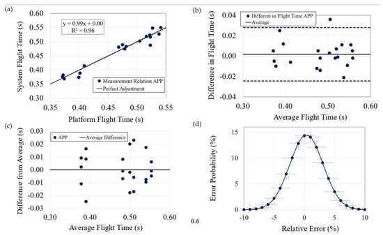 Statistical analysis of data (flight time): (a) Data correlation; (b) Deviation concerning average of both systems; (c) Deviation for each subject; (d) Gauss bell of flight time error.