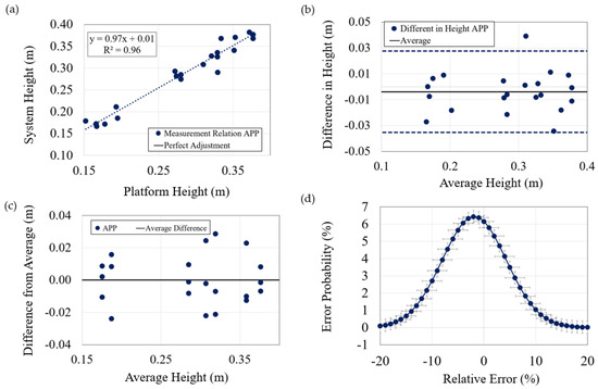 Similarly, the data and results for the case of jump height measurements were analyzed (Figure 6). The obtained linear regression was 0.97x + 0.01, with an factor of 0.96. The variation of the difference between the measurements obtained from the system and the platform, in relation to their average for each test, also falls within the range of 2 SD, with the exception of one value exhibiting a deviation of 0.011 m from the margin. Additionally, the maximum difference between the average of the three attempts of a subject and the measurement of each individual attempt is only 0.028 m. In terms of errors, when considering their absolute values, they result in (4.57 ± 4.48)% (0.013 ± 0.13 m), while they are (−1.84 ± 6.2)% (−0.005 ± 0.018 m) when considering the sign. Both cases still provide very low values. Finally, the probability of encountering an error greater than 10% is only 4.69%.