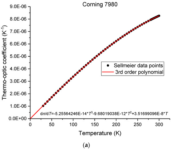 The experimental data underpinning this work was obtained by Leviton et al. [47,48,49,50] through measurements performed by the method of minimum deviation using the Cryogenic, High-Accuracy Refraction Measuring System (CHARMS) [51,52]. This technique enables the determination of the thermo-optic coefficients with an uncertainty in the order of 2 × 10−8 [47]. Therefore, for the Corning 7980 sample the refractive index values were measured for the temperature range from 30 to 300 K and for the wavelength range from 0.4 to 3.6 μm. The experimental data was fitted to a temperature and wavelength dependent Sellmeier expression of the form: