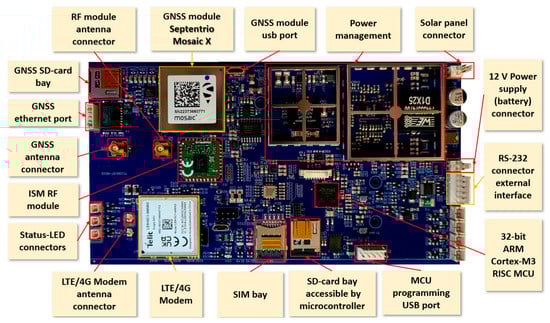 The hardware architecture is shown in Figure 1. All the peripherals and I/O connectors shown in the picture are integrated into a single printed circuit board (PCB), except of course, the lead acid battery and photovoltaic panel. Therefore, the so-called “GREAT GNSS receiver”, shown in Figure 2, integrates in a single and compact device all the components needed to easily run a reference station shown in Figure 1.