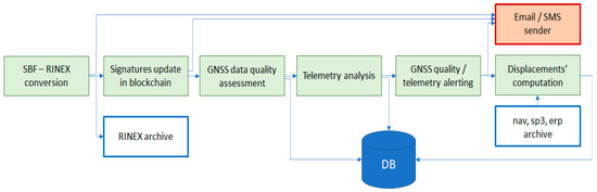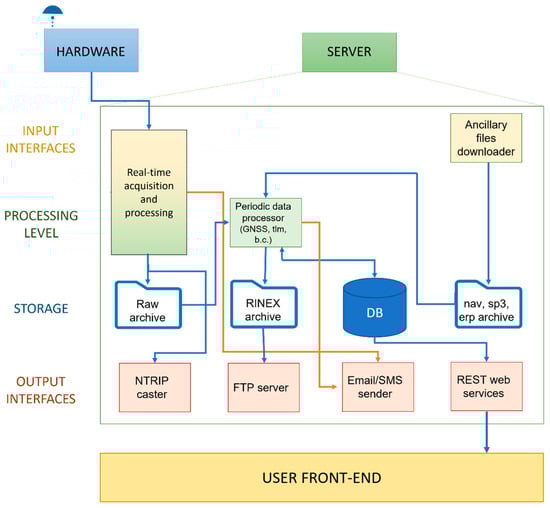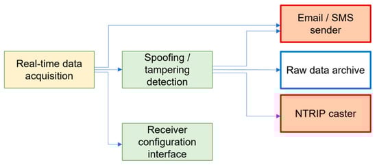 According to the general architecture of GREAT, several functionalities of the system are not implemented at hardware level by they are demanded to software components designed to run on a remote “acquisition and processing server”. Such server module is mainly dedicated to real-time data acquisition and validation (in terms of possible spoofing and tampering, as of GNSS quality check), to their archiving and publication both as real-time (RTCM 3.2 corrections) or post-processing (RINEX 3 or 4) products. The server software also includes modules for user alerting through email and SMS. Figure 4 represents the functional architecture of the developed software.