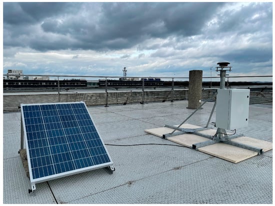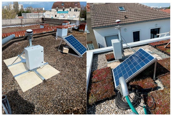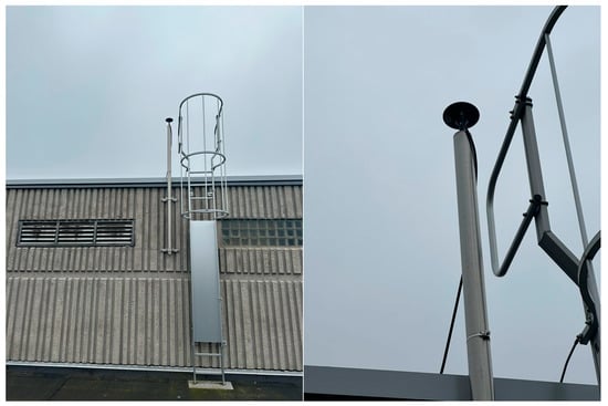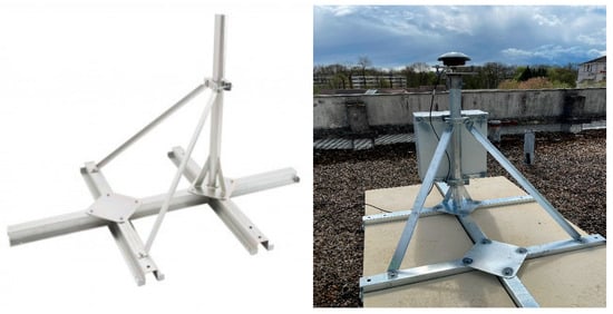 The antenna is monumented to the ground using a “roof pallet” structure, a solution already exploited by Teria (part of the GREAT consortium and responsible for the field tests) in its operational installations of permanent GNSS stations (see, for example, https://rgp.ign.fr/STATIONS/#chdy, accessed on 28 June 2023). The consortium is aware that such a monumentation solution does not meet the strict IGS Monumentation Design and Implementation Recommendations (https://igs.org/station-resources/#monumentation-recommendations, accessed on 28 June 2023); anyway, we considered relevant for the purpose of the project (i.e., to design and develop cost effective solutions for the implementation of reference GNSS stations) to investigate the possibility to exploit this kind of monumentation type and to quantify the achievable performance in terms of antenna stability and quality of the generated GNSS data. This solution has the advantage of being extremely low-budget, quick and easy to install. In detail, the structure used for the monumentation consisted in: